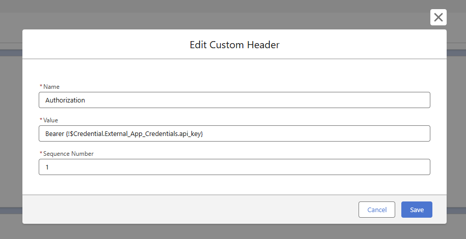 Authorization: Bearer {!$Credential.External_App_Credentials.api_key}) to include your Bearer token in the API request.